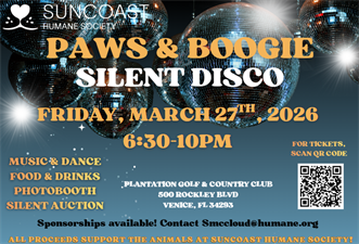 Get ready for an unforgettable night, all in support of shelter animals at Suncoast Humane Society! On Friday, March 27th, 2026, our Second Annual Silent Disco, Paws & Boogie, brings together music lovers of all ages for a unique dance experience that gives back to a great cause. Every ticket purchased directly supports the care of our most vulnerable animals.